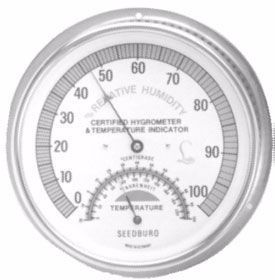 Seedburo ofrece el medidor No. 444T lee la humedad relativa De 0 a 100% y temperatura de 0 a 200 ° F y -20 a 100 ° C en incrementos de 1 ° en un dial de 4-1 / 2 "con números negros en una caja de cromo de dorado. + INFORMACIÓN
